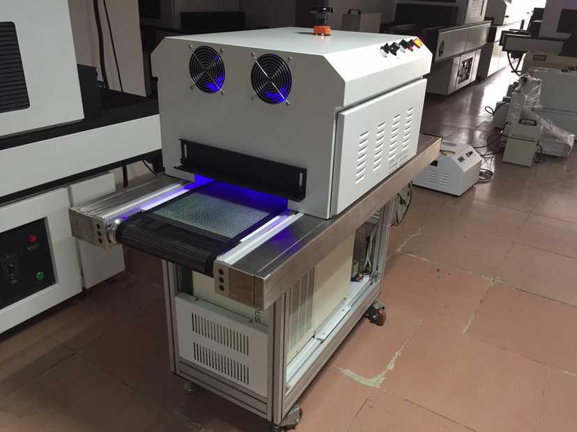 1)臺式uv機(jī)是利用UV光源來固化UV涂料的設(shè)備,如UV漆,UV油墨,UV膠等,與UV涂料里的光敏劑起化學(xué)反應(yīng),瞬間干燥固化。UV固化機(jī)的核心部件即UV燈管,峰值365nm,效果更佳的則是采用金屬鹵素?zé)簦ㄩL峰值380nm,用于難以固化,涂層較厚的UV油墨等。